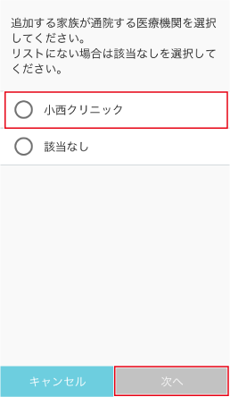 家族の名前、生年月日、性別、診察券番号を入力し、[次へ]をタップします。