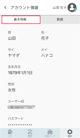 ユーザー登録時に入力した名前やユーザーID、パスワードなどのアカウントの基本情報を確認、変更できます。また、健康記録で使用する身長などの基本情報を登録できます。