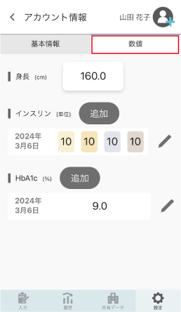 [インスリン]と[HbA1c]は、[追加]をタップすると新規入力画面が表示されます。入力履歴は3回分保存されます。健康記録で使用されるのは最新情報のみです。