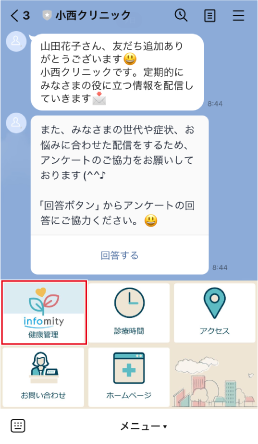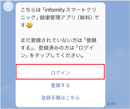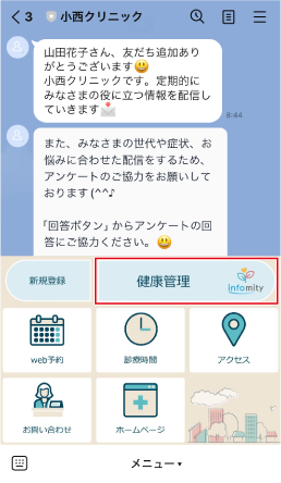 トーク画面下部にあるメニューに[健康管理]または[infomity健康管理]が表示されている場合は、これらのボタンからログインできます。