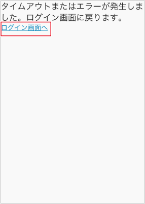 タイムアウトエラーが表示された場合は[ログイン画面へ]をタップし、再度ログイン画面からログインしてご使用ください。